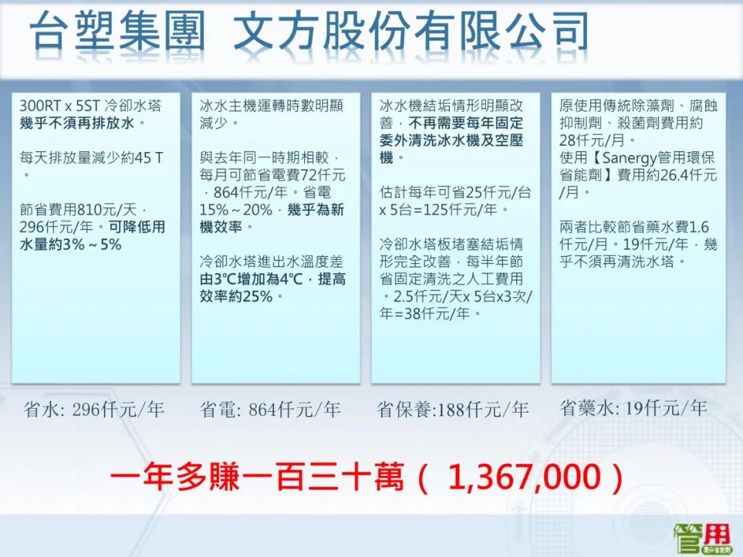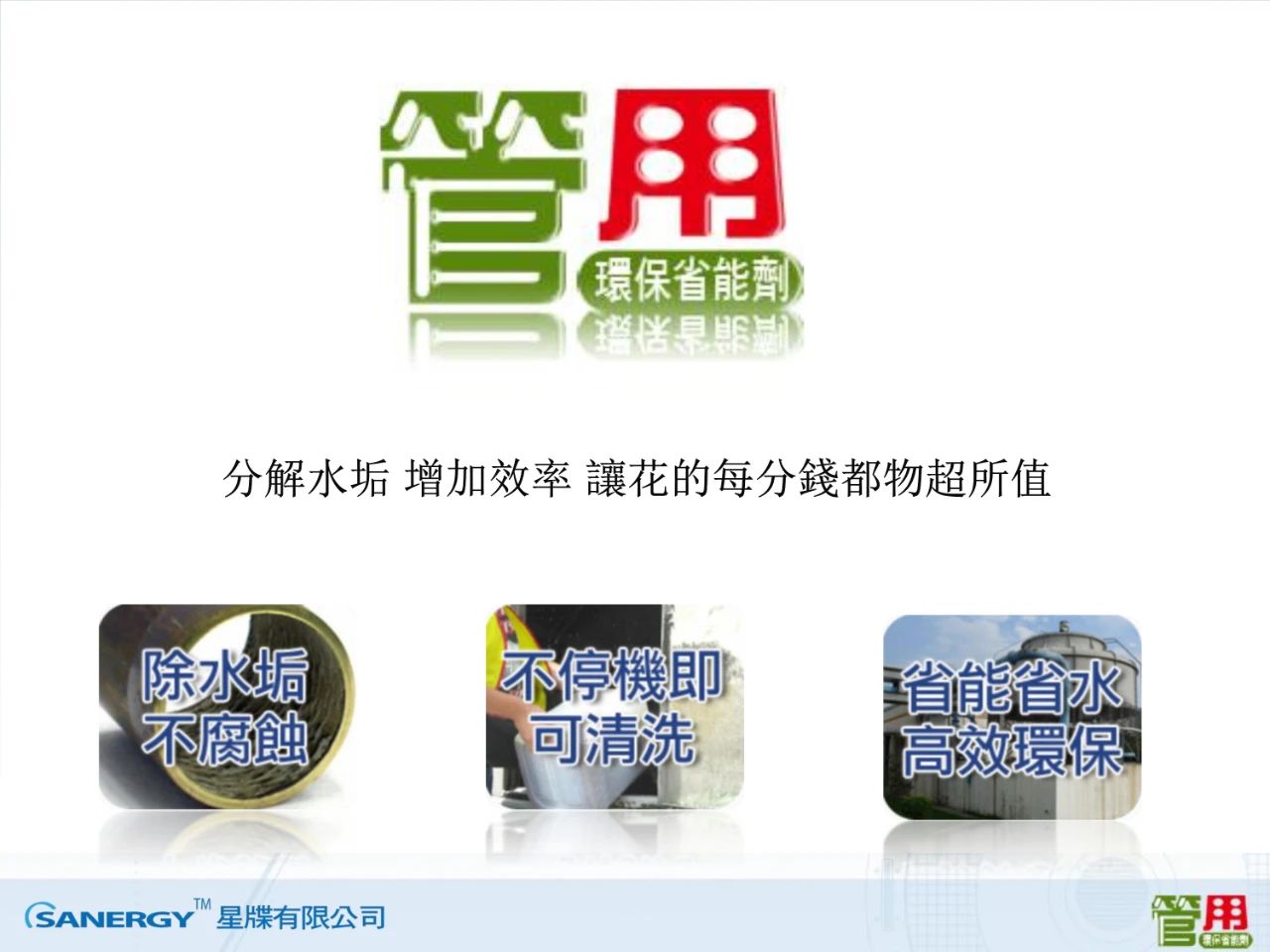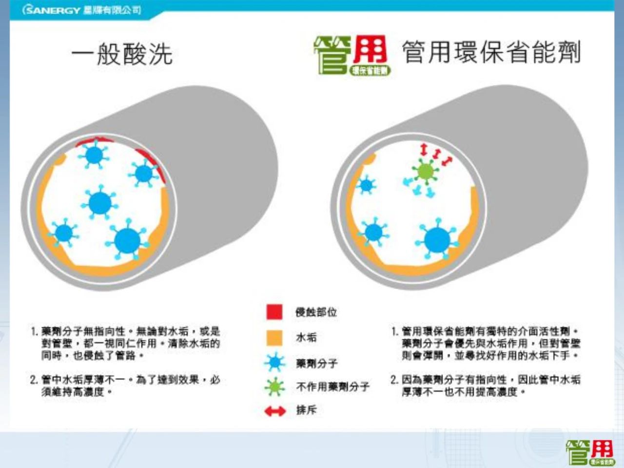优先提供一个干净的水质环境,以供注塑机作业添加“Sanergy管用环保省能剂”分解系统内的污垢,净化水质清除已经积累的污垢,以渐进的方式提升效率