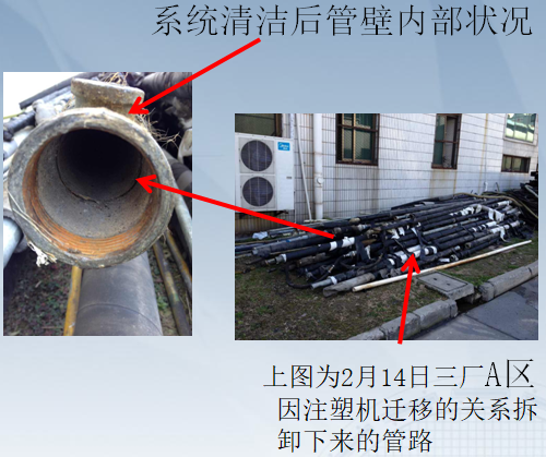 经过1个月的系统清洁工作,注塑机管路内的污垢已经被清洗得较干净。