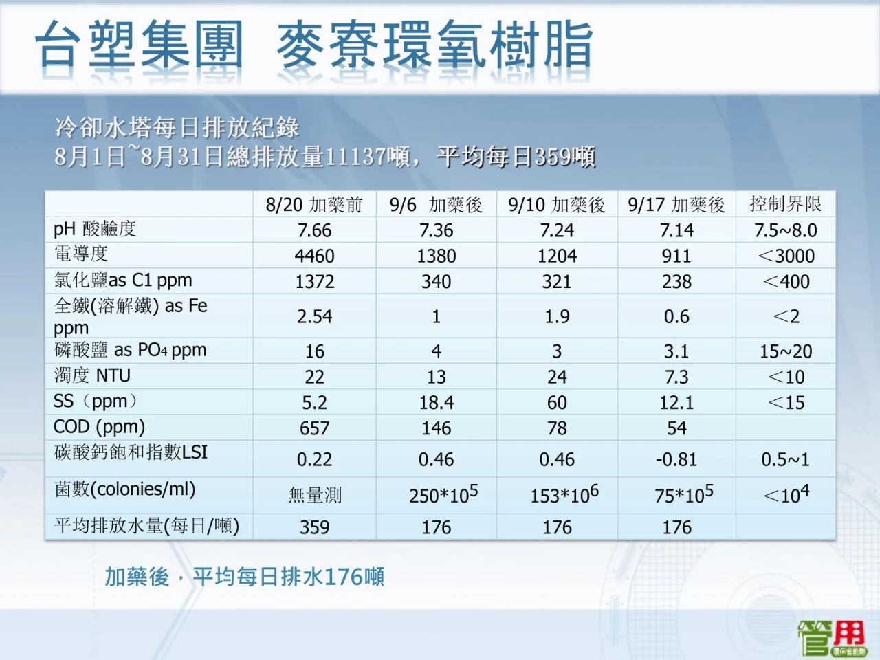 ④加药后,每日检测浊度、导电度,监控冷却水系统变化状况,以此调整加药浓度,达成清洗目的